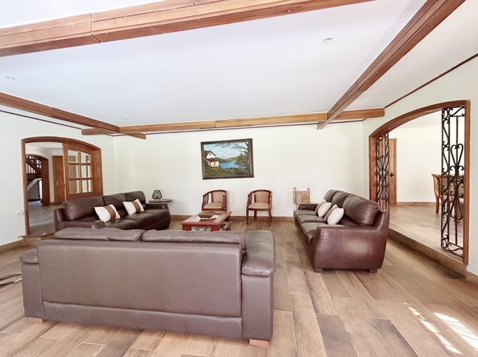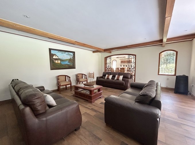 Living con vigas a la vista y chimenea