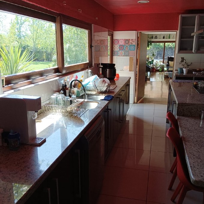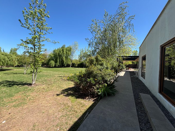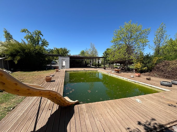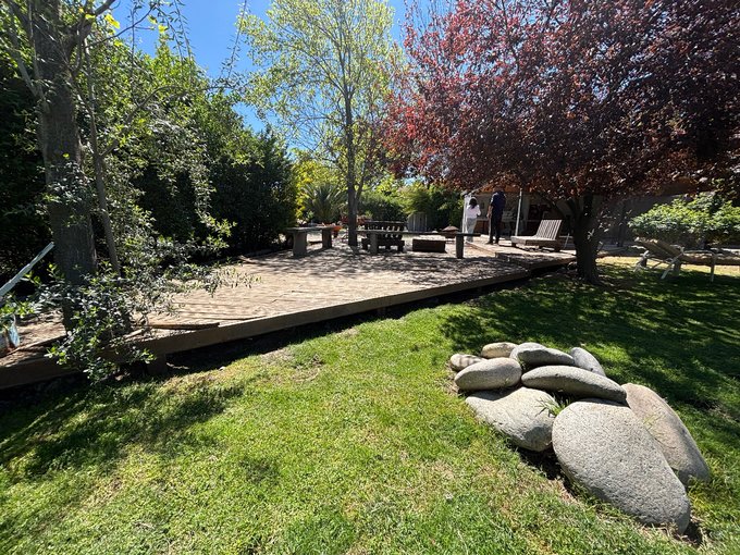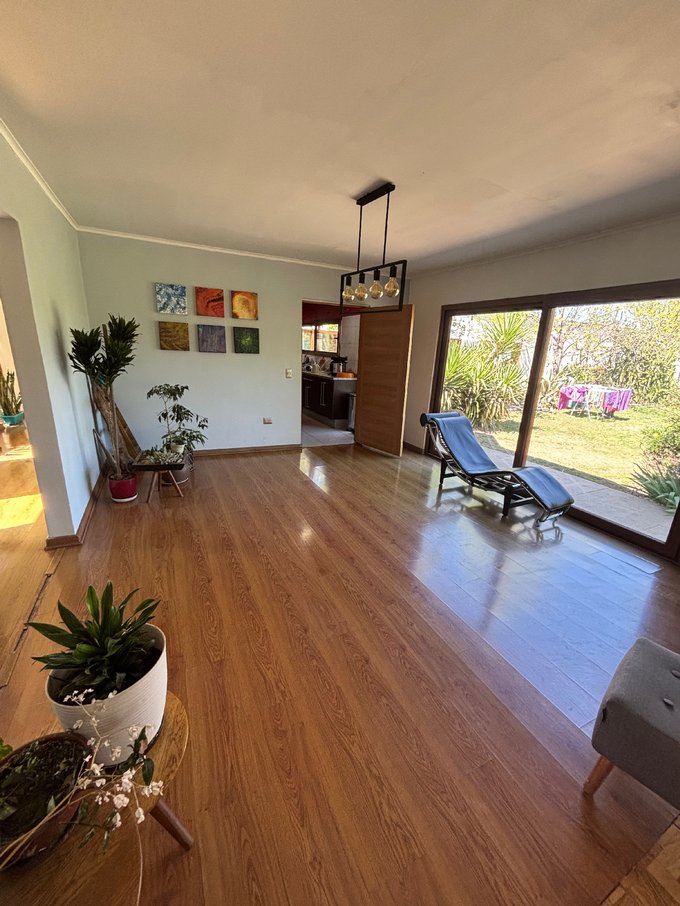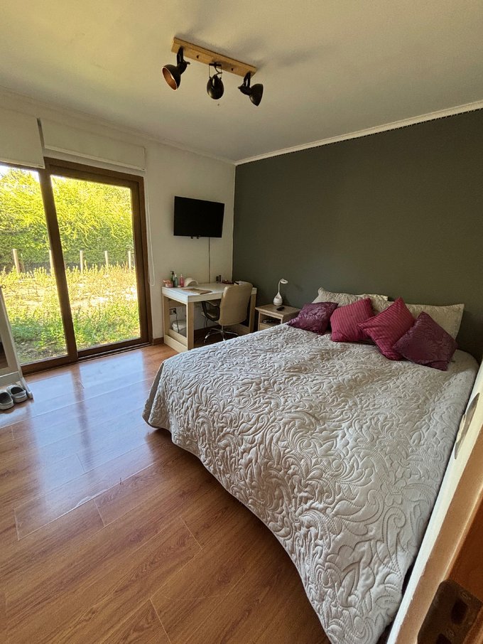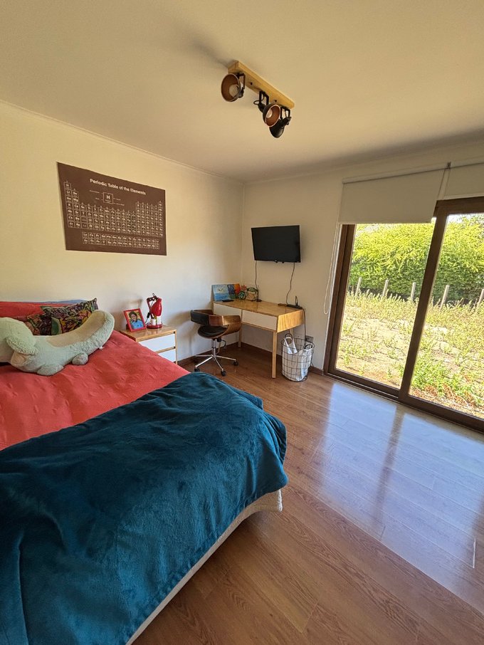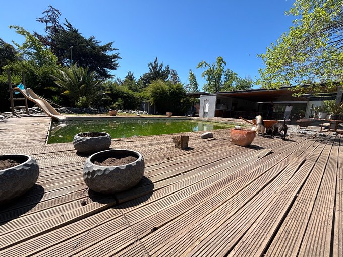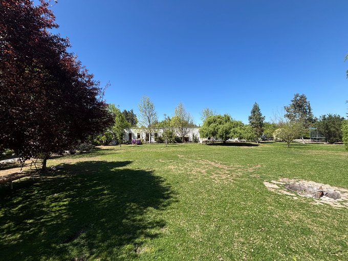 Hermoso jardín formado con variedad de árboles frutales (naranjos, manzanos, almendros, limoneros, tunas, entre otros), terraza con quincho y baño exterior, piscina de hormigón 10 x 6, canil, y huerto listo para reactivar.