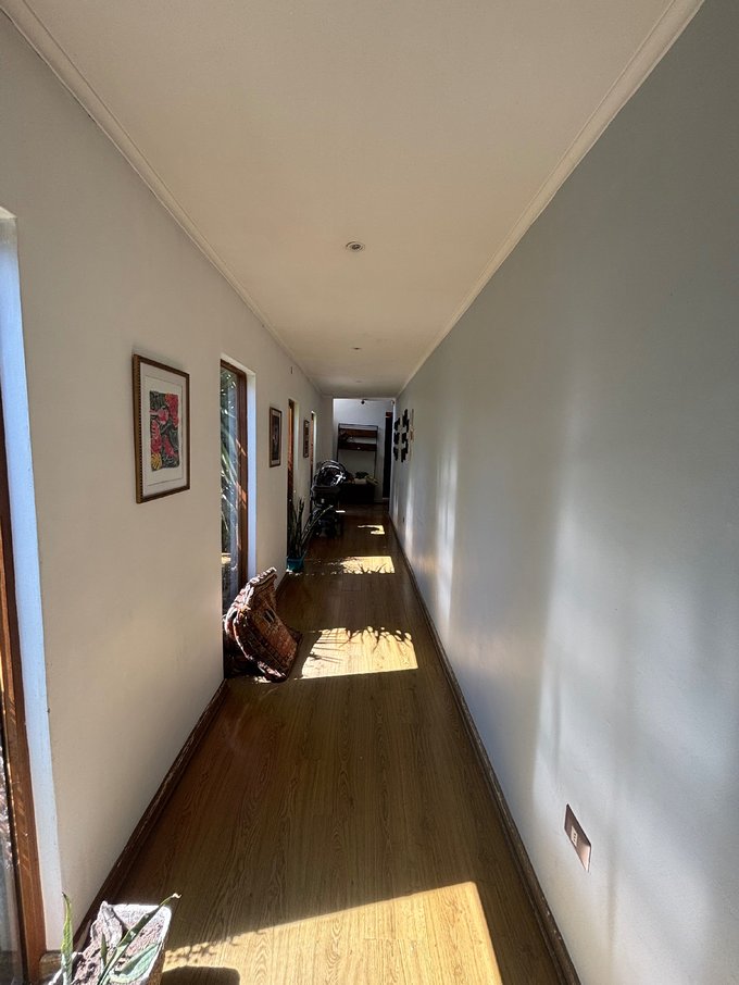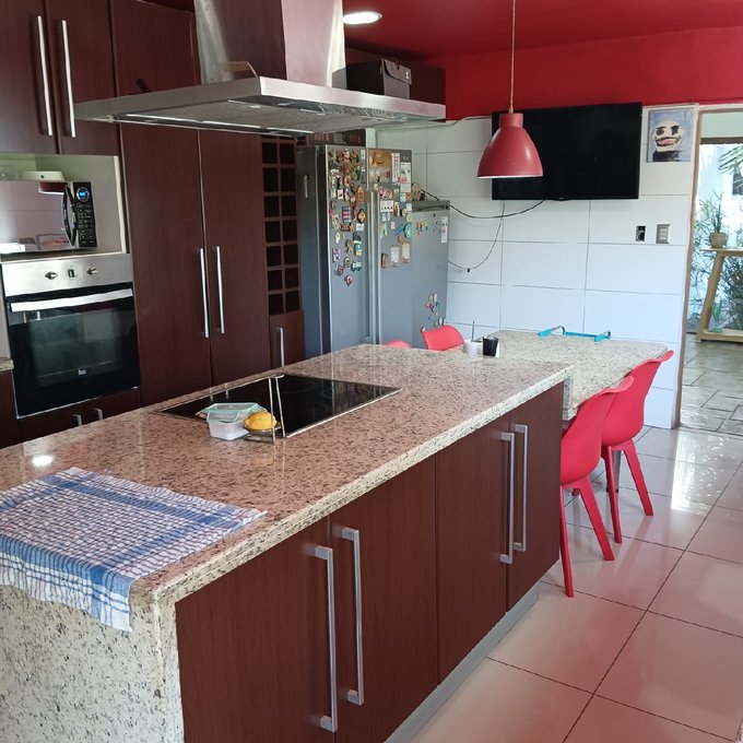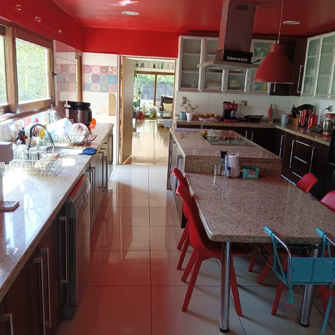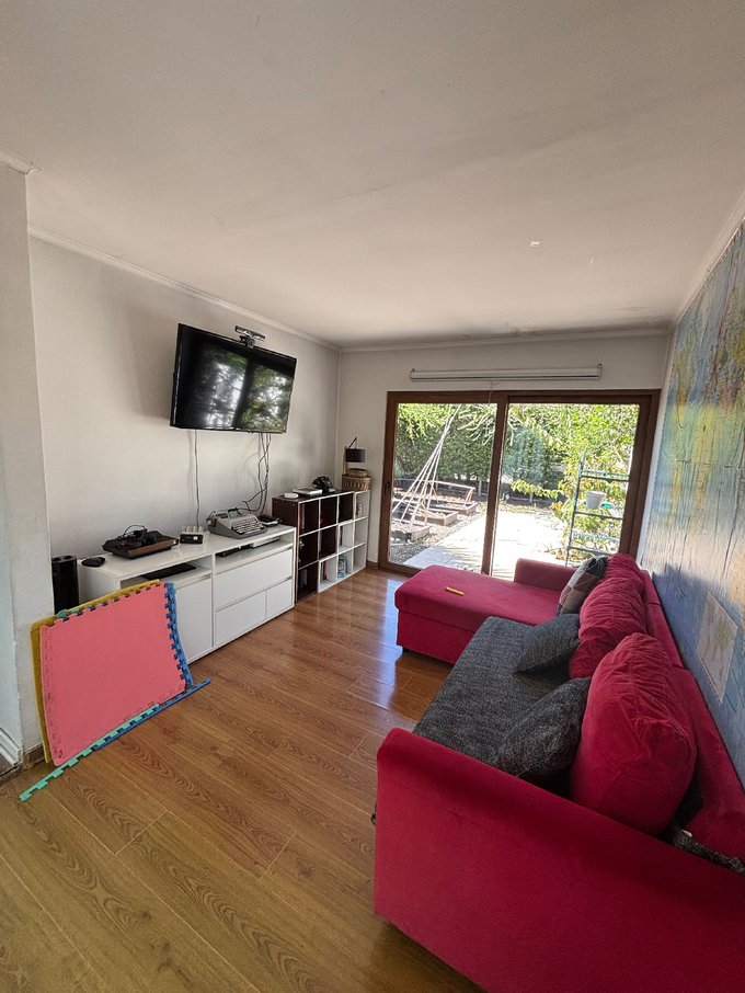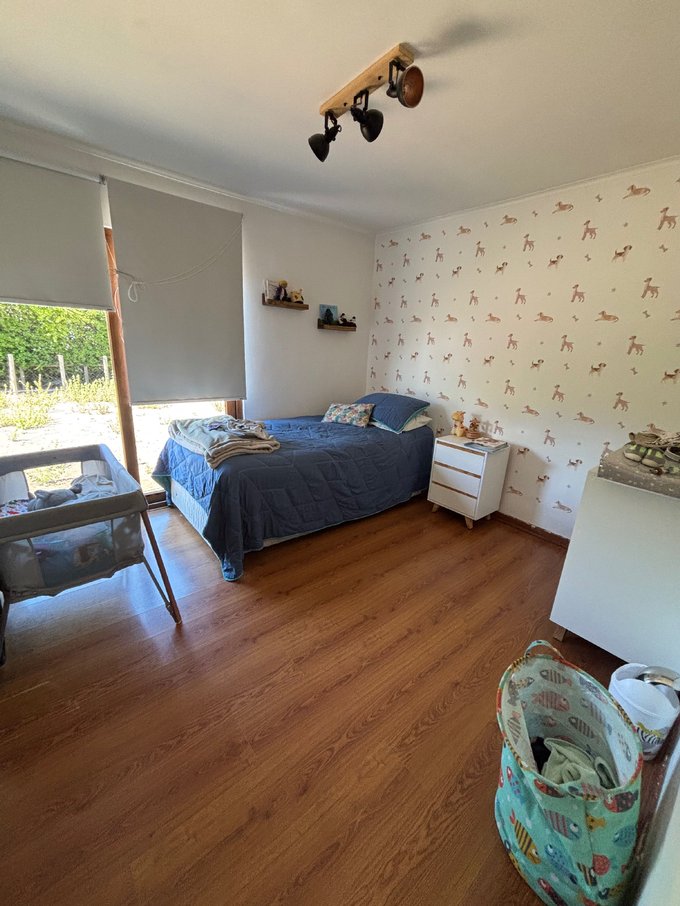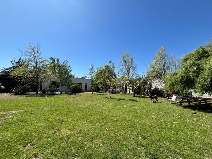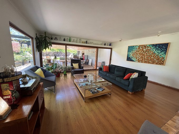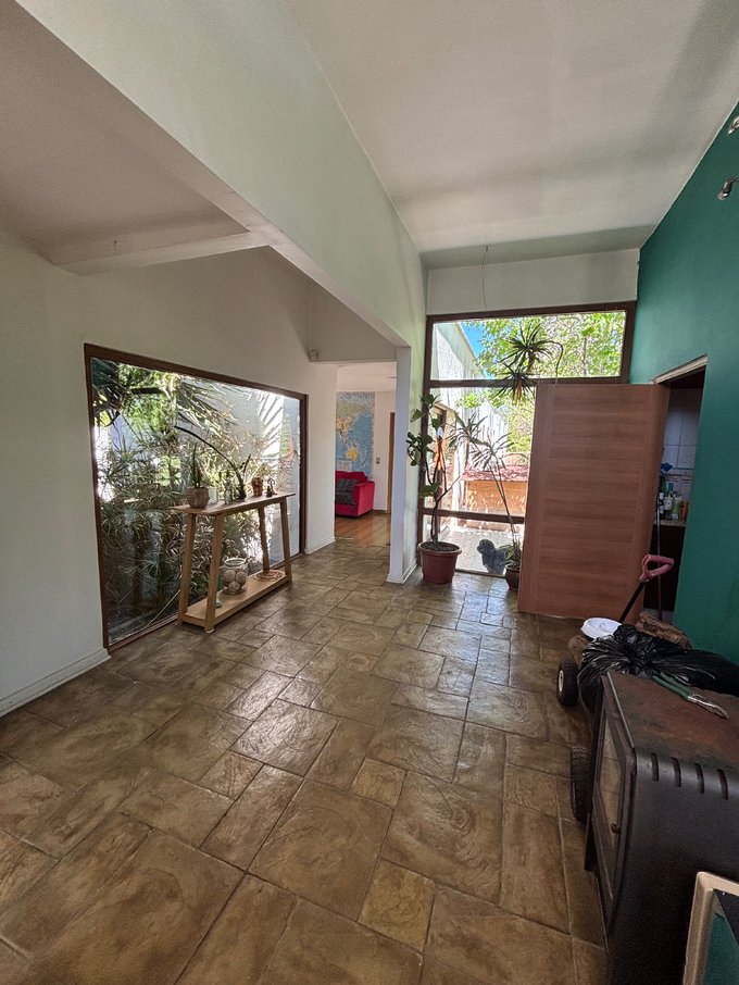 Hermoso jardín formado con variedad de árboles frutales (naranjos, manzanos, almendros, limoneros, tunas, entre otros), terraza con quincho y baño exterior, piscina de hormigón 10 x 6, canil, y huerto listo para reactivar.