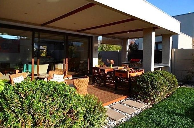Jardín con riego automático, piscina, terraza techada con barbecue incorporado con parrilla a gas. Estacionamiento amplio para 2 autos. Excelente ubicación dentro del condominio.