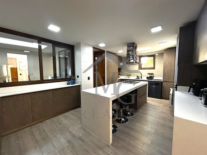 -Cocina equipada con horno, campana, microondas, gran mesón isla con cocina central.