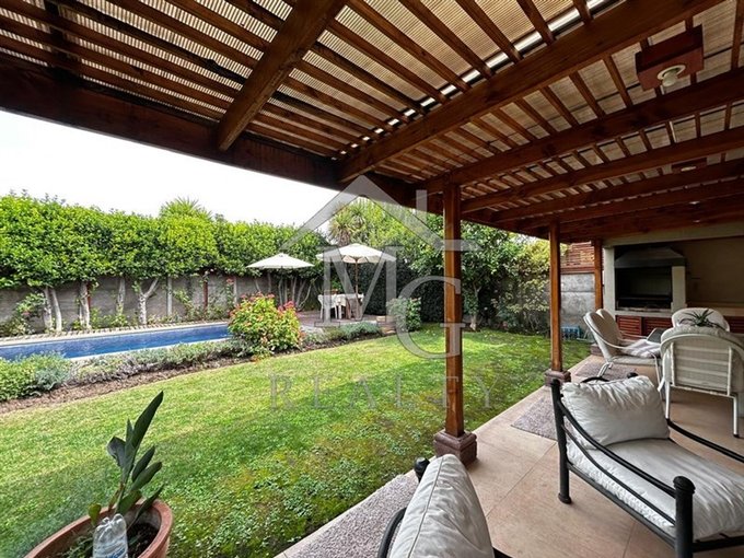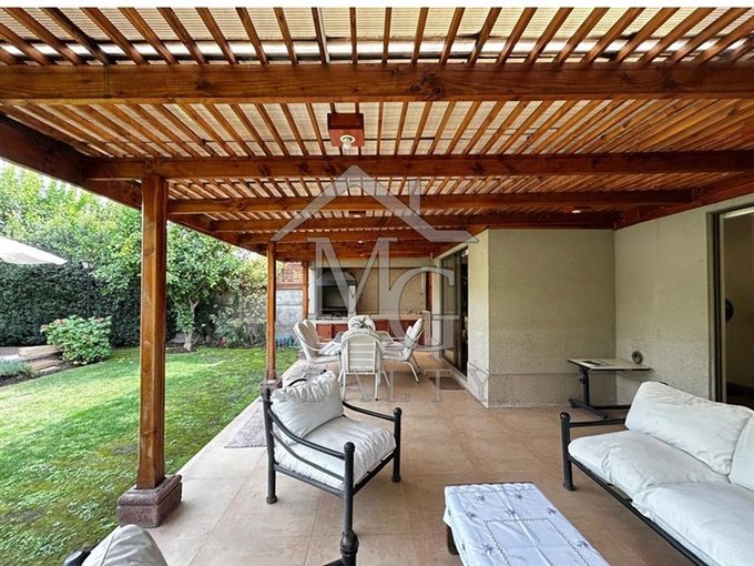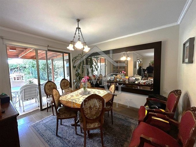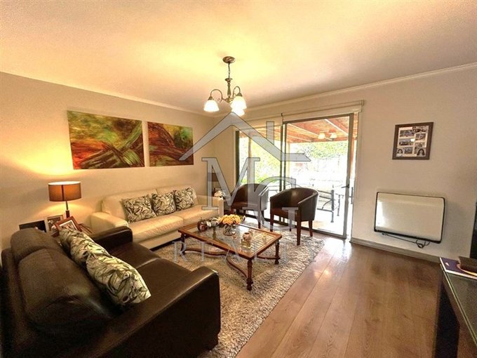 Living comedor en ambientes separados con amplia vista al jardín y salida a terraza techada con quincho.