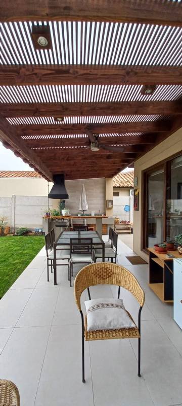 Además, tiene una terraza de 20 m2 con orientación Poniente. Gastos comunes aproximados de $140,000. Entre sus atributos se encuentran: Terraza techada con quincho, Patio amplio con piscina temperada. Amplia Cocina equipada amoblada y cuenta con barra desayunadora, Comedor, living en desnivel. Dormitorio principal en Suite Walkin clóset, Sala de estar y/o Sala de juegos, Lavandería, Baño de visitas, y Estacionamiento para invitados. En un entorno seguro con áreas verdes y acceso controlado 24/7. Comuna tranquila y con excelente calidad de vida. Ubicada en Chicureo, ¡Una oportunidad única para vivir con todas las comodidades!