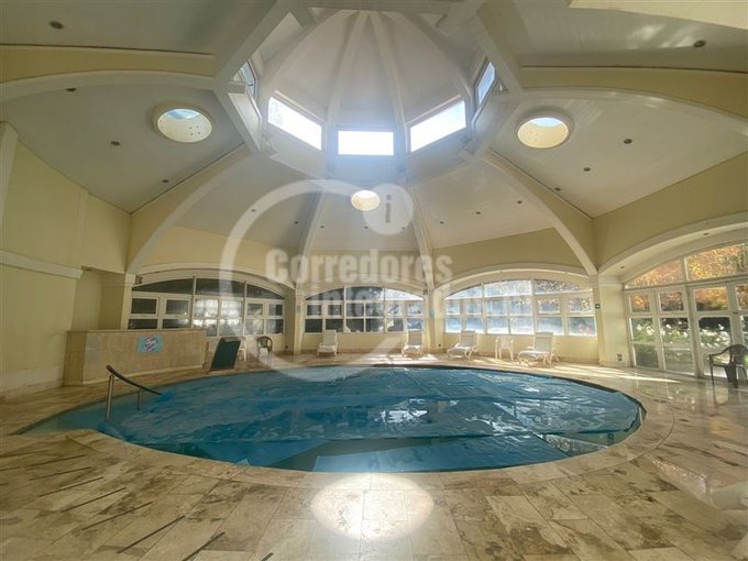 Piscina Temperada con amplios ventanales que dan al jardín, techo con ventanales.