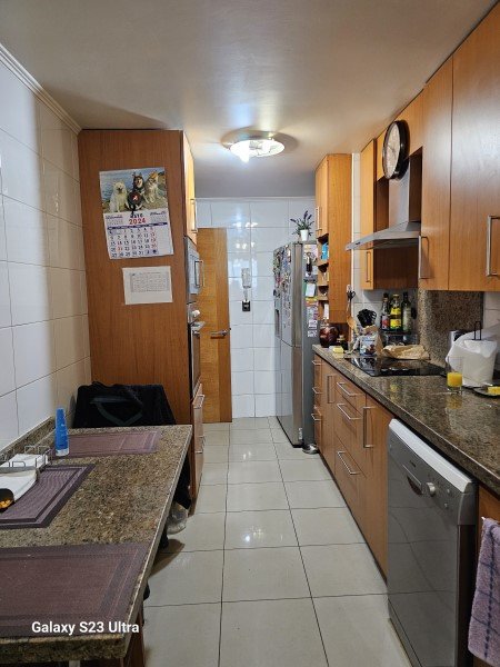 Cocina con cubierta de granito y piso de porcelanato, equipada con horno eléctrico, campana y encimera de vitrocerámica, microondas, y lavavajillas.