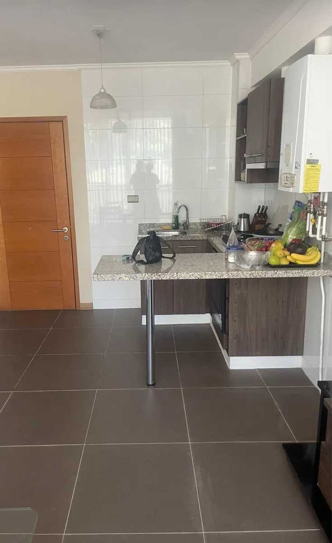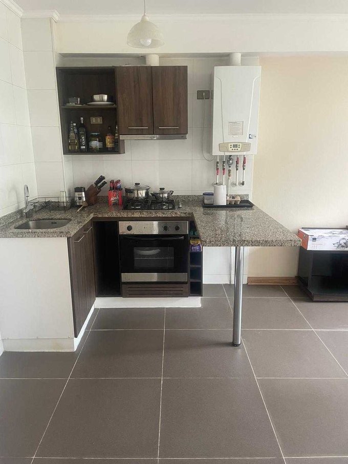 El departamento cuenta con living, cocina americana, 1 dormitorio en suite, 1 baño, conexión para lavadora, ventanas Termopanel, caldera a gas independiente, 1 estacionamiento, 1 bodega.
