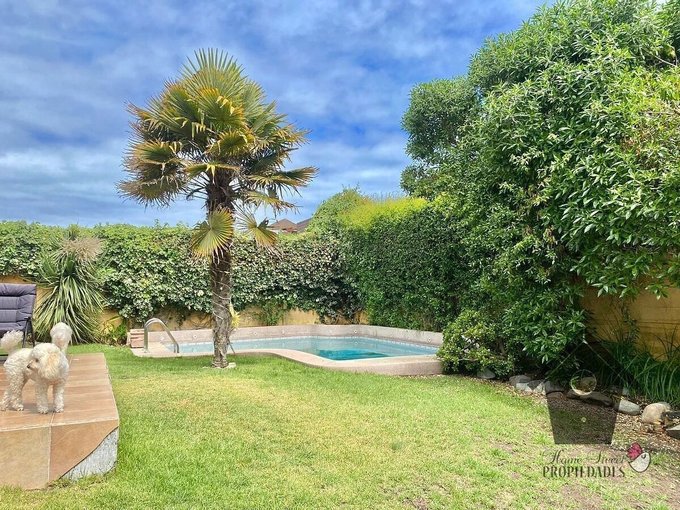 Exteriores: Al frente una marquesina o techo de entrada, un ante-jardín y estacionamiento para dos autos. Atrás un hermoso jardín con terraza y piscina.