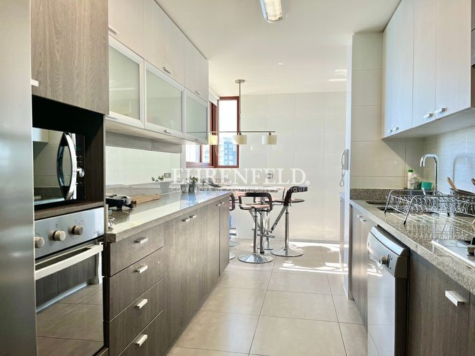 Piso flotante tipo madera en dormitorios. Porcelanato en accesos, cocina y baños. Cocina amoblada y equipada con amplia loggia independiente. Comedor de diario.