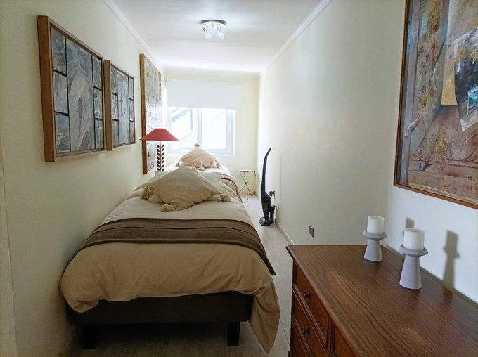 Tiene un cuarto dormitorio con baño, fuera y frente a la entrada del departamento, que puede ser usado como dormitorio de servicio, un cuarto dormitorio independiente con baño para visitas, o bien como escritorio o bodega.