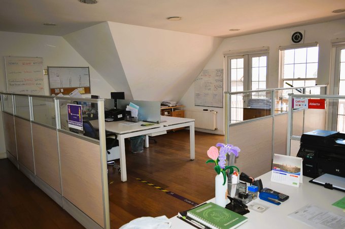 Segundo Piso: zona de trabajo abierta, 3 privados, 2 baños, balcón. Amplios espacios.