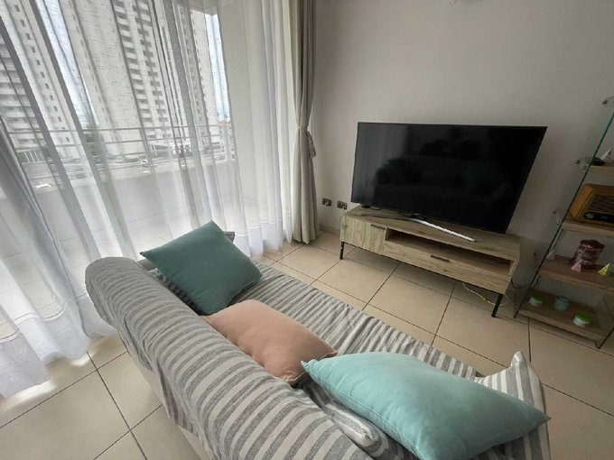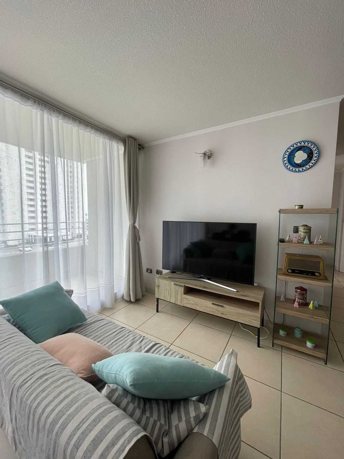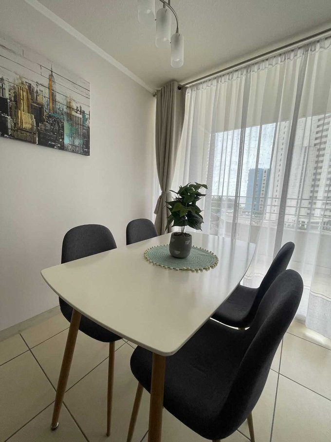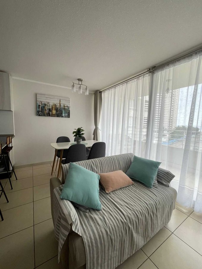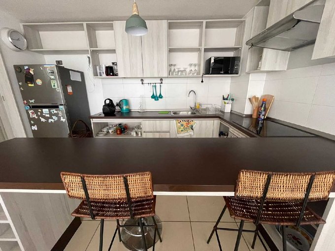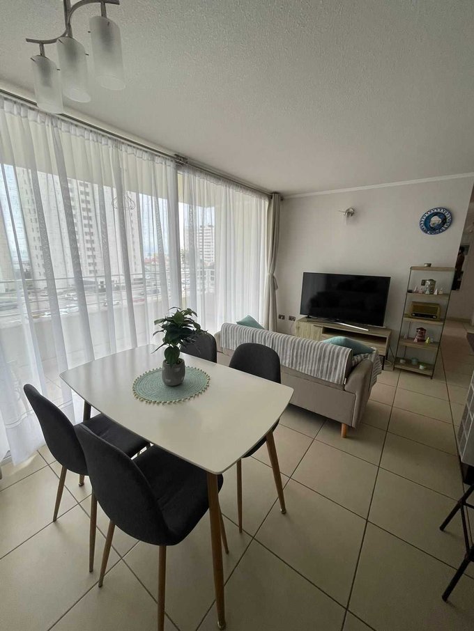 Departamento ubicado en quinto piso con ascensor y cuenta con 63 metros cuadrados construidos y se divide en dos dormitorios, dos baño, living y comedor, cocina americana: amoblada y equipada.