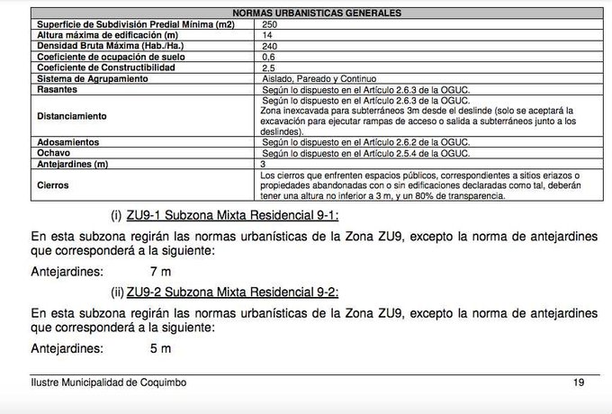 Terreno ubicado en Zona Mixta Residencial 9, dentro de zona AR2, según PRC vigente, zona inundable o potencialmente inundable por maremoto, por razones de seguridad, en estas áreas se limita todo tipo de construcciones hasta que se cumpla con lo establecido en el Art. 2.1.17 de la OGUC. Las normas urbanísticas que se aplicarán cuando se cumplan los requisitos establecidos en la antedicha disposición corresponderán a las prescritas para cada una de las zonas sobre las que se superpone el área de riesgo AR2 en los Planos.