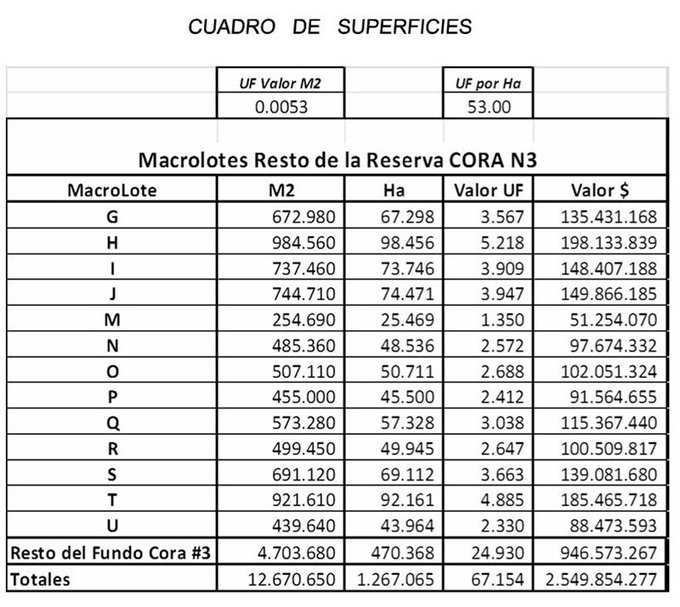 Solo venta en su conjunto: UF 53,00 por hectárea, totalizando UF 67.154,00