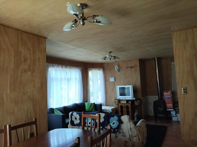 La casa tiene piso Flotante en sala de estar, cerámica en baño y cocina, dormitorios alfombrados, bosca (leña)