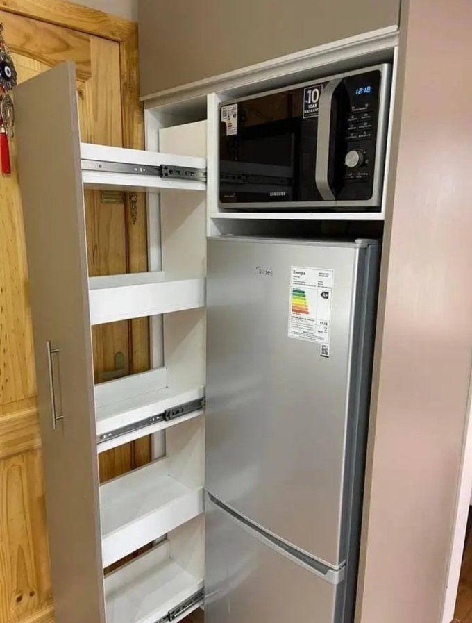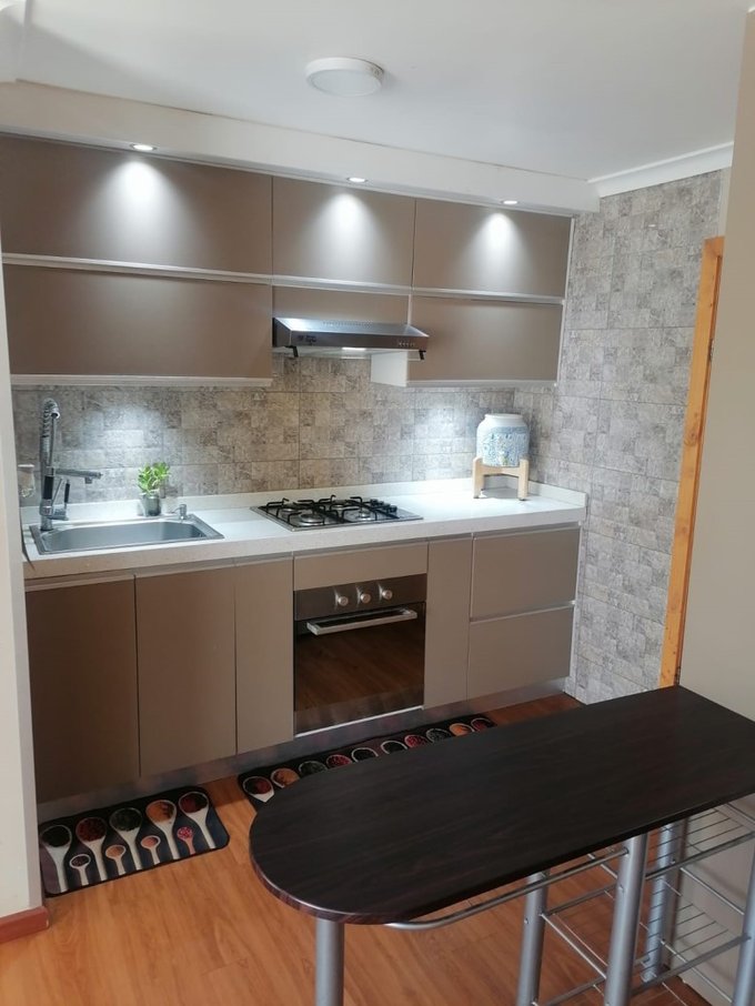 Cocina amoblada con cubierta de cuarzo blanco (Incluye refrigerador y horno eléctrico)
