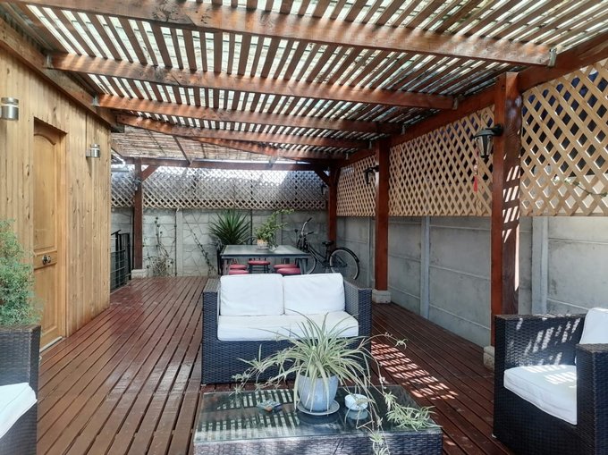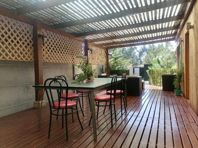 Terraza de pino Oregón y con vigas a la vista.