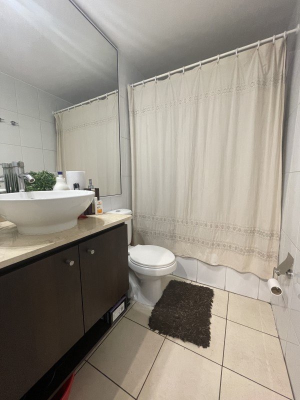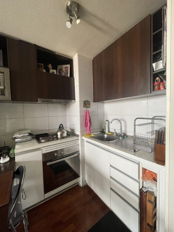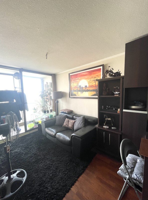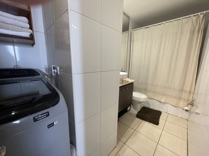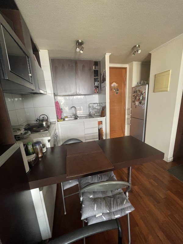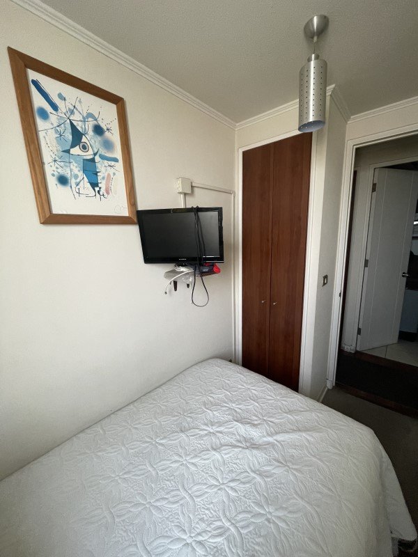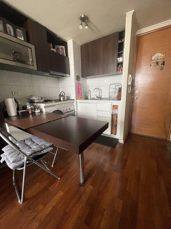 La propiedad cuenta con 2 dormitorios con clósets, 1 baño amplio con tina y conexión para lavadora, cocina americana amoblada, terraza con vista despejada al sur y espacio para despensa. El dormitorio principal posee piso flotante y el departamento mantiene alfombra en muy buen estado, además de papel mural.