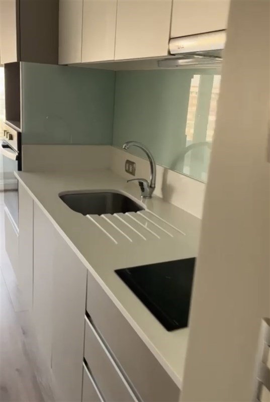 Cocina americana con cubierta de cuarzo, vitrocerámica, campana retráctil, y horno eléctrico