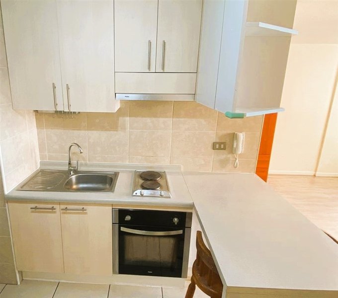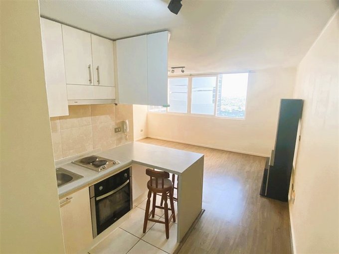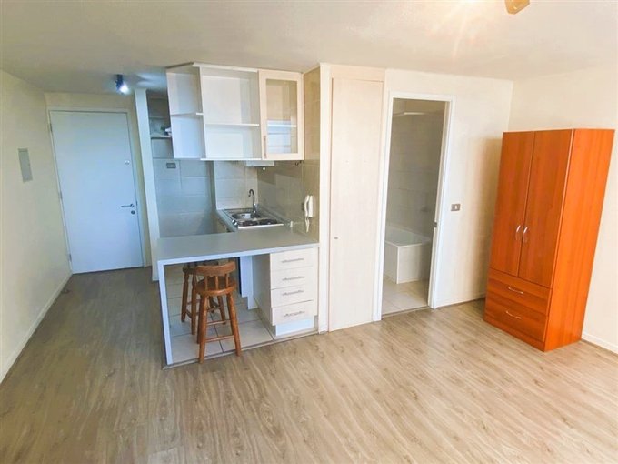 IMPECABLES TERMINACIONES Dpto. tipo estudio muy acogedor , ubicado en Radal 18 piso 16, cuenta con cocina americana equipada con encimera electrica de 2 platos , horno eléctrico,campaña extraible electrica, espacio para refrigerador, muebles de cocina murales , colgantes , cajones y mesada , baño completo con tina, vanitorio de marmol con instacion de lavadora , Closet empotrado , rack, ropero,2 pisos , lamparas y barras para cortinas.
