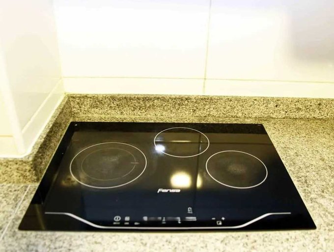 -Cocina americana con cubierta de granito, equipada con encimera, horno eléctrico y campana