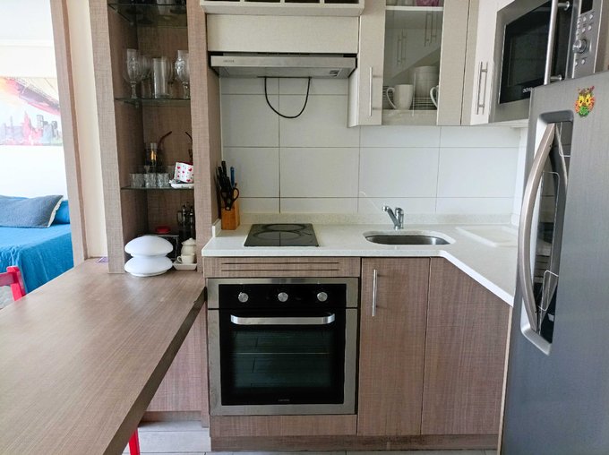 - Cocina americana con encimera, horno empotrado, campana, todo eléctrico.