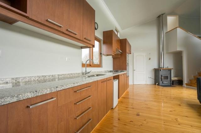 ESTUPENDA CASA construida solamente hace 4 años, estilo construcción con fundaciones cemento, construcción madera con envigados de madera en pisos y muros, internit y volcanita, revestimiento siding, fibrocemento. Cielos con vigas de madera a la vista, cocina incorporada, dos dormitorios, 2 baños, principal en suite, sala para yoga, terraza, ventanas de pvc blanco con thermopanel. La casa tiene agua potable, alcantarillado, electricidad, fibra óptica, gas licuado para cocina y baños, baños con calefont tiro forzado, dos bodegas. La casa está en proceso de Recepción final. Código interno Procasa: 68387