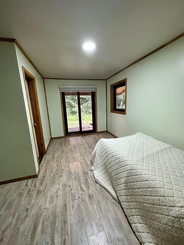 Desde la entrada hacia la izquierda se ubica el dormitorio principal en suite con Walking closet y aplicaciones de tejuela de alerce reciclado en muros y otro dormitorio adicional posible de ocupar como oficina.