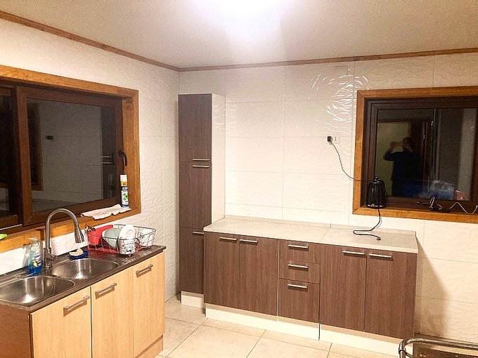 Desde la entrada se accede al living comedor y hacia la derecha se encuentra el comedor integrado con la cocina. Tiene una cocina a leña instalada cocina y puerta de salida al patio. Posee acceso a logia amplia para maquinas de lavado y secado.