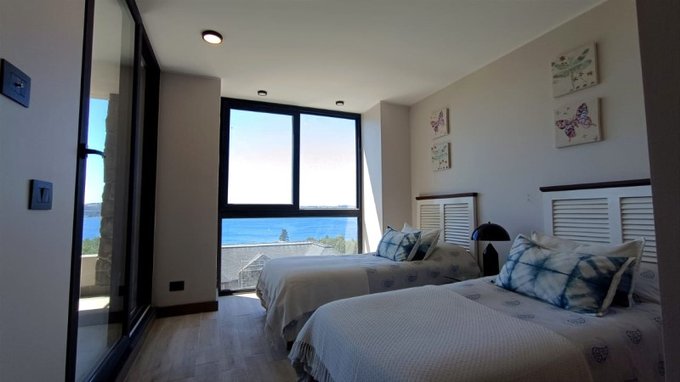 Hacia la izquierda se ubica el pasillo para habitaciones secundarias, ambas con vista al lago, y un baño completo que comparten.