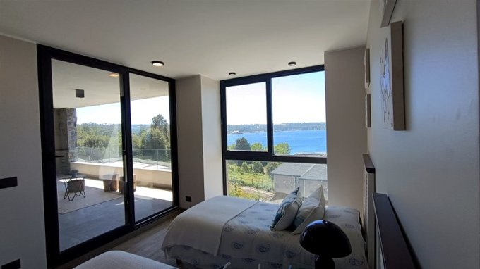 Hacia la izquierda se ubica el pasillo para habitaciones secundarias, ambas con vista al lago, y un baño completo que comparten.