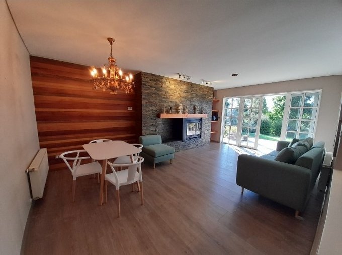 El living tiene chimenea ecológica y aplicaciones en madera y revestimiento de muro estilo piedra.