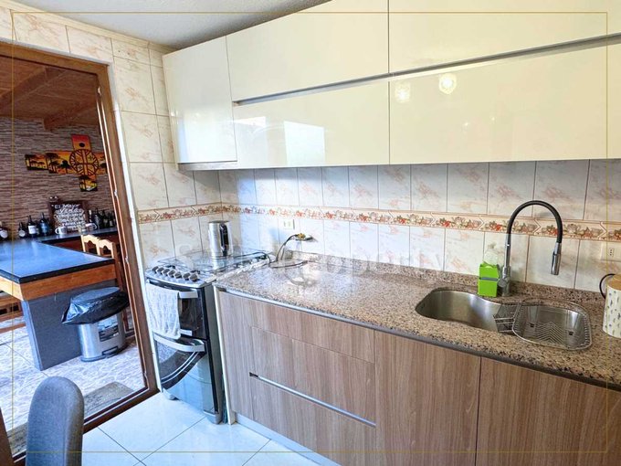 La cocina, completamente equipada y remodelada, destaca por su diseño funcional y moderno. Cuenta con muebles de gran capacidad, encimera amplia y conexión directa a una terraza techada donde se ubica un espectacular quincho cerrado, ideal para celebraciones o para disfrutar tranquilamente cualquier día del año.
