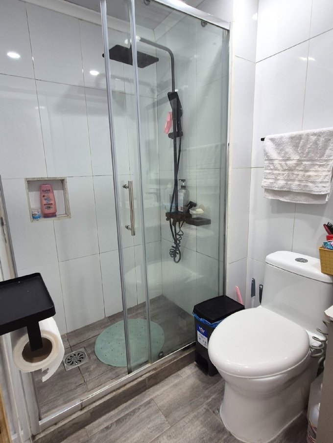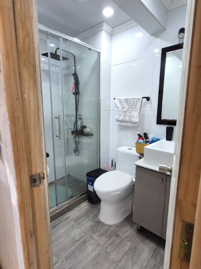 1 Baño, con Shower, mampara cristal templado. WC, Ducha tipo rainshower" (efecto lluvia) en acabado negro mate, espejo empotrado, cerámico blanco. Luces Led. Vanitorio con mueble. Piso cerámico con diseño tipo madera.