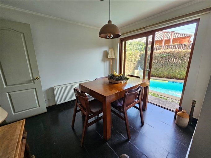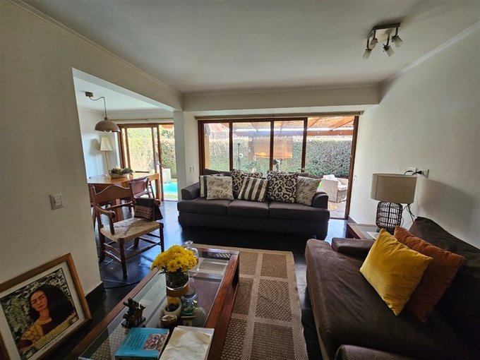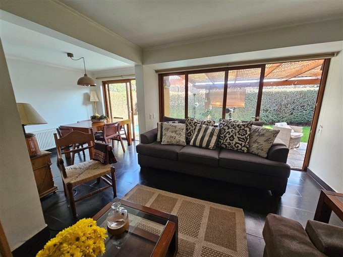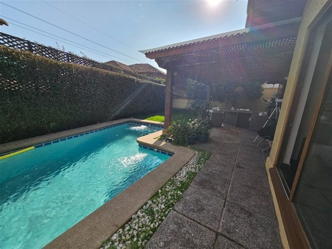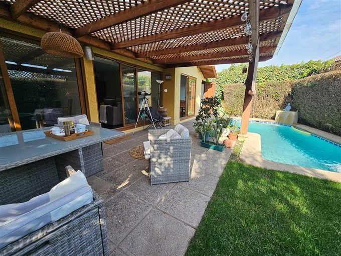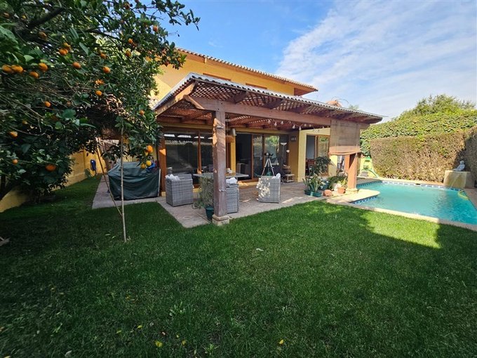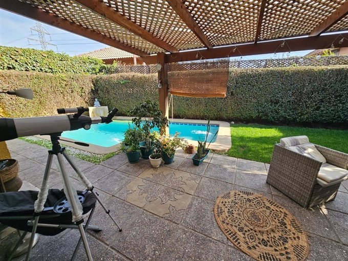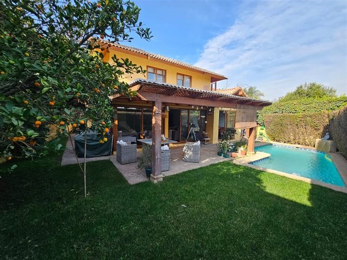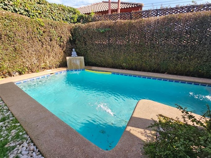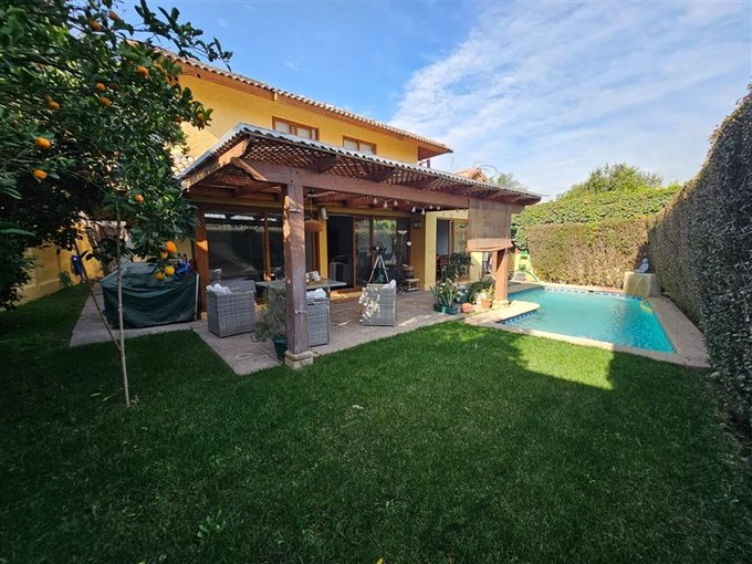 Piscina con cascada, terraza techada; lindo jardín con árboles frutales; estacionamiento para dos autos.