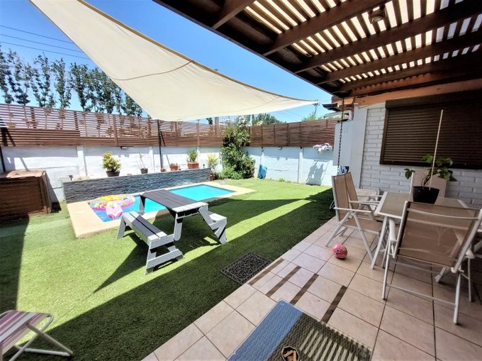 Lindo jardín formado con césped y arbustos, piscina, terraza techada, estacionamiento para dos autos.