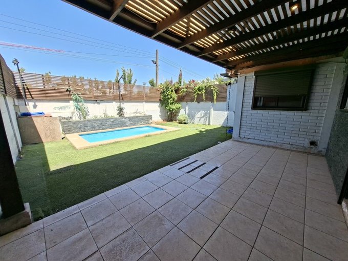 Lindo jardín formado con césped y arbustos, piscina, terraza techada, estacionamiento para dos autos.