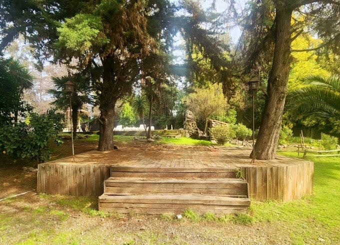 3 Estacionamientos techados y estacionamiento capacidad para estacionamiento liberado, Piscina con cascada, Laguna de peces con cascada, Escenario, Sala de eventos semi techado con mobiliario, sala de Quincho 10x10 , horno , Sauna Firlandes 4 p, Casa infantil en arbol para juegos, casa de acopio de leña, Variedad de Arboles frutales, Palmeras. capacidad disponible para Cancha de Mini futbol