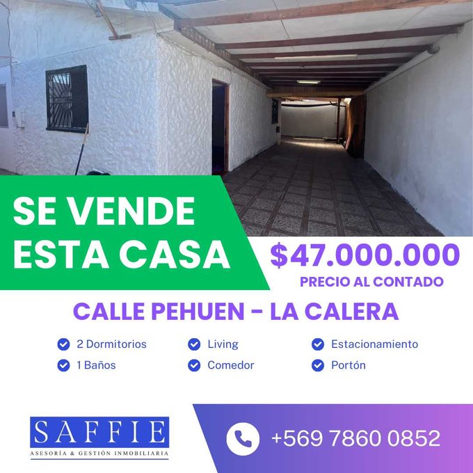 Descubra su nuevo hogar en la acogedora comuna de La Calera, Valparaíso, una joya escondida que ofrece la perfecta combinación de confort y conveniencia. Esta encantadora casa, con 60 m de construcción sólida, es una oportunidad única para quienes buscan calidad de vida o una excelente opción de inversión. Gracias a sus 2 dormitorios y un baño, cada rincón de esta residencia ha sido diseñado pensando en la funcionalidad y el bienestar de sus habitantes. Además, la propiedad cuenta con el lujo de 2 estacionamientos, brindando comodidad y seguridad a su llegada.