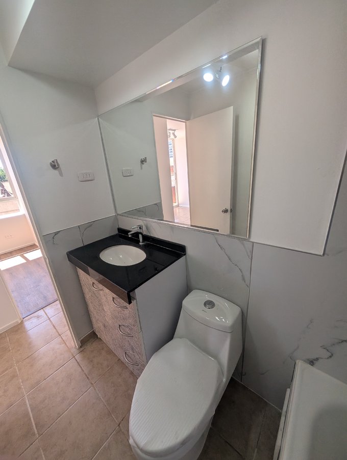 El baño cuenta con tina, vanitorio y superficies de fácil mantención.