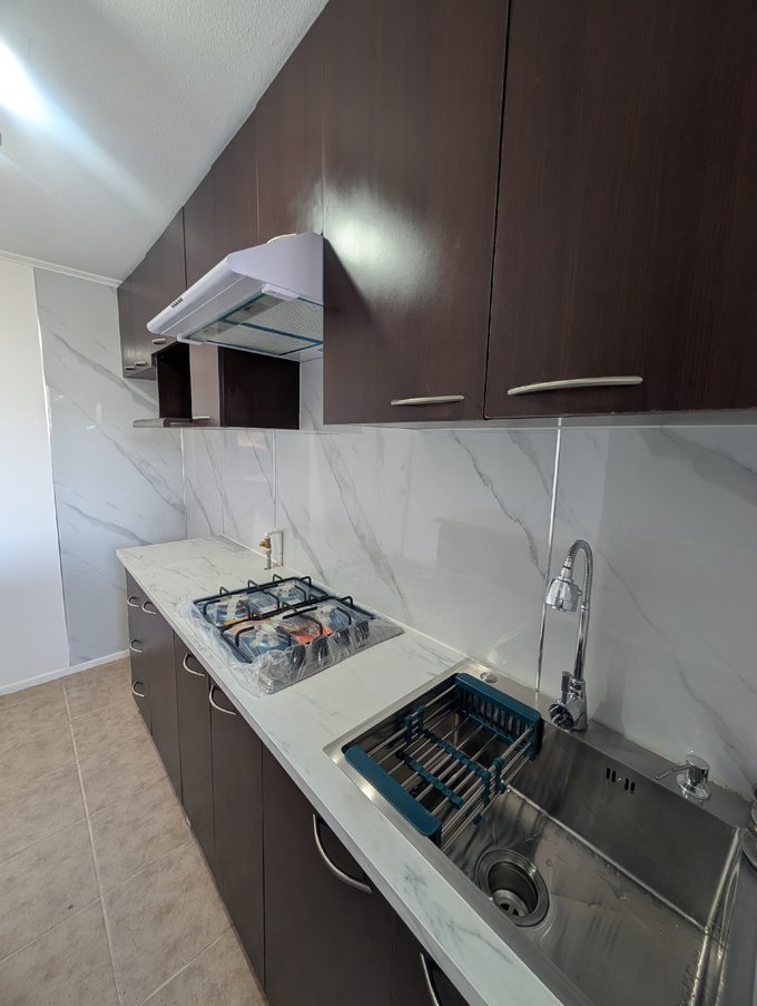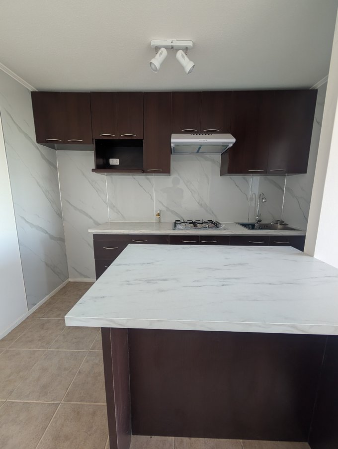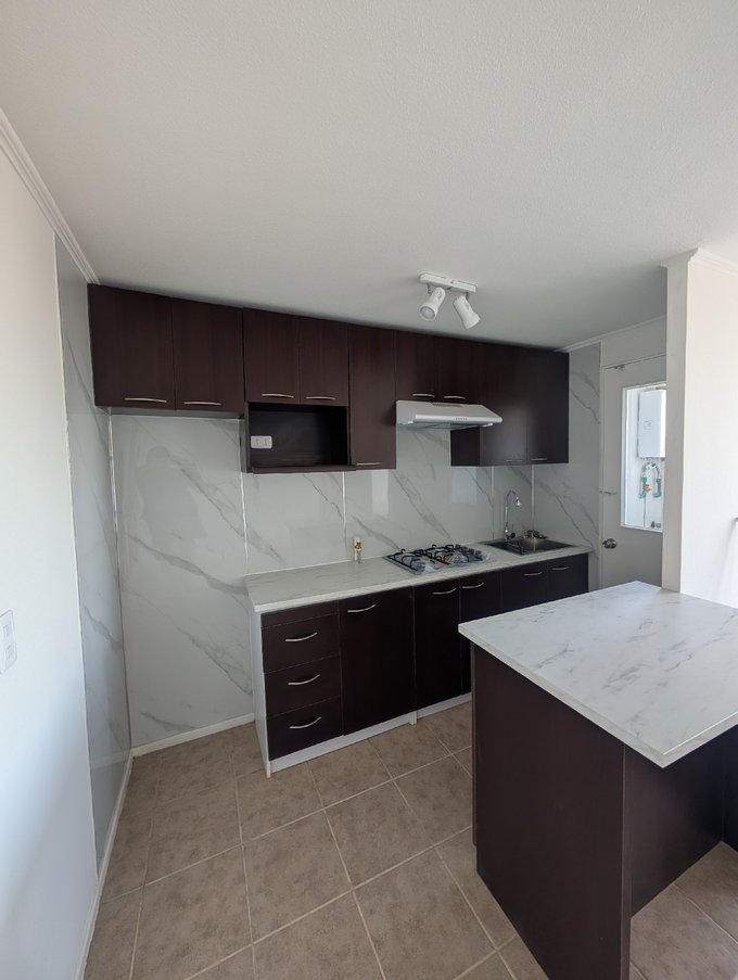 La cocina integra mobiliario en tonos oscuros, cubierta tipo mármol, encimera y campana, junto a un área independiente para lavado con conexión a lavadora y ventana al exterior.