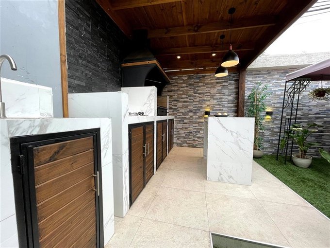 Moderna Área de Quincho externo con espacio para parrilla, es una área social maravillosa!