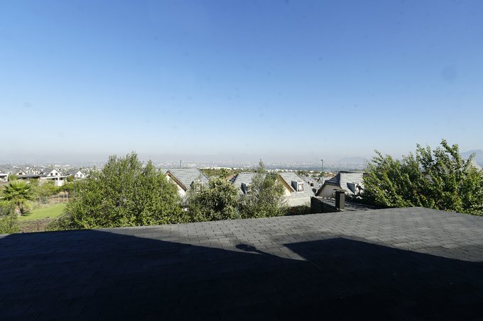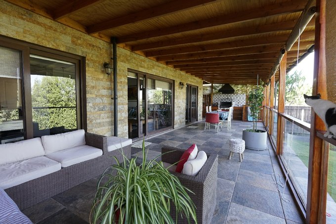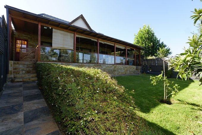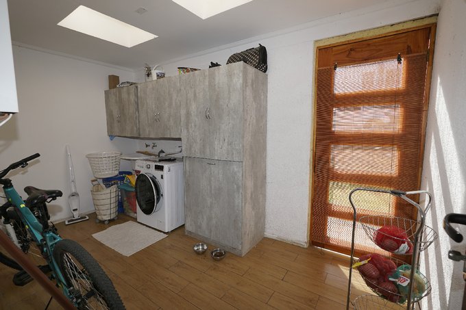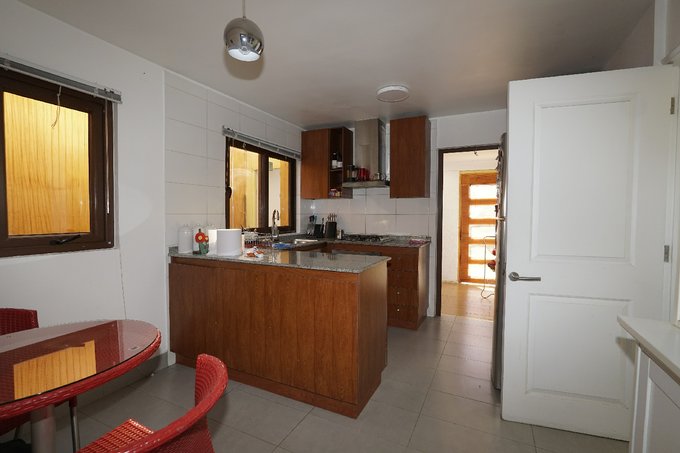 La casa dispone de una amplia terraza cubierta, con espacio para comedor y zona de estar, además de un quincho exterior con parrilla y muebles de apoyo. El jardín trasero ofrece áreas de césped y vegetación, proporcionando un ambiente agradable.