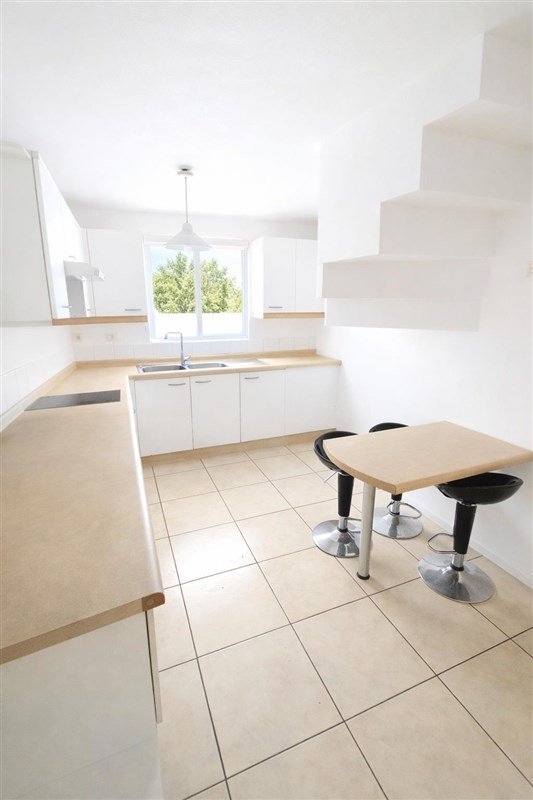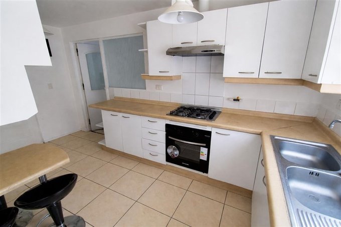 Cocina cerrada con muebles empotrados con horno campana y encimeras conectados a una amplia Loggia o despensa.