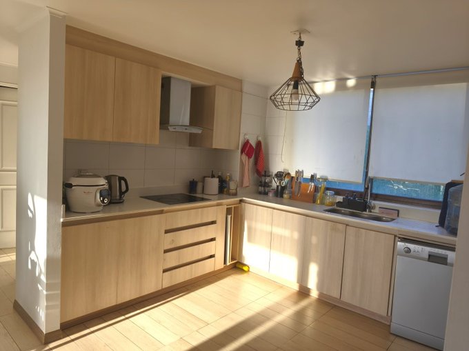 - Cocina integrada con encimera vitrocerámica, campana y horno eléctrico.