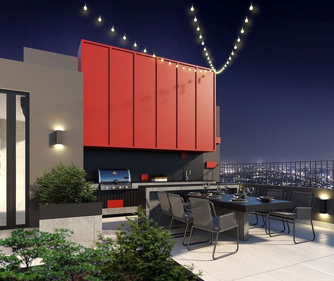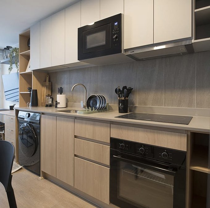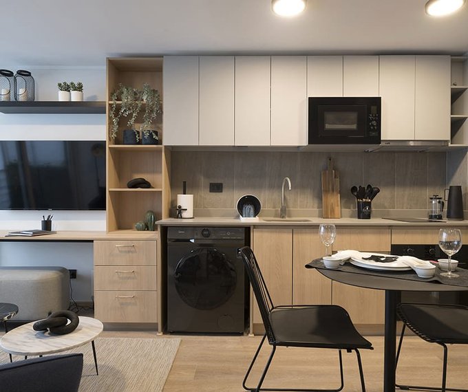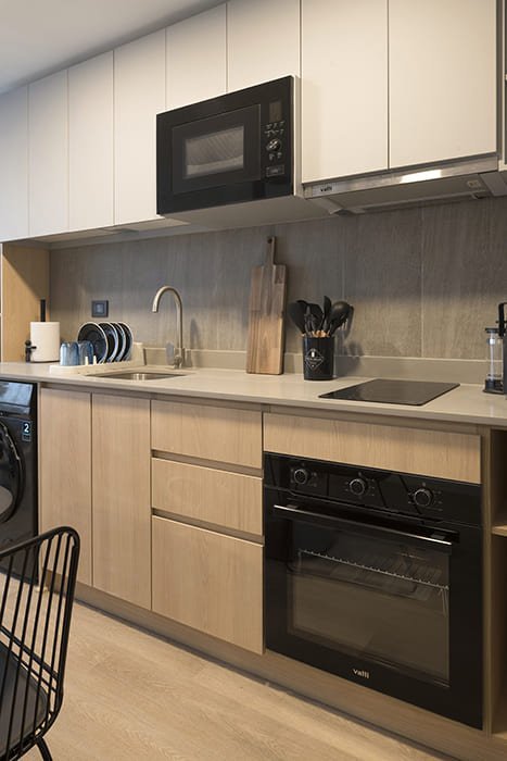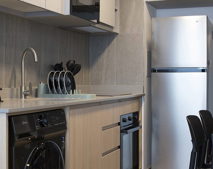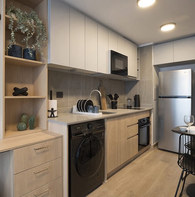 Cocina equipada, refrigerador, microondas, lavadora, focos, cortinas roller, cerradura digital.