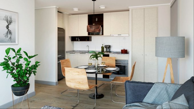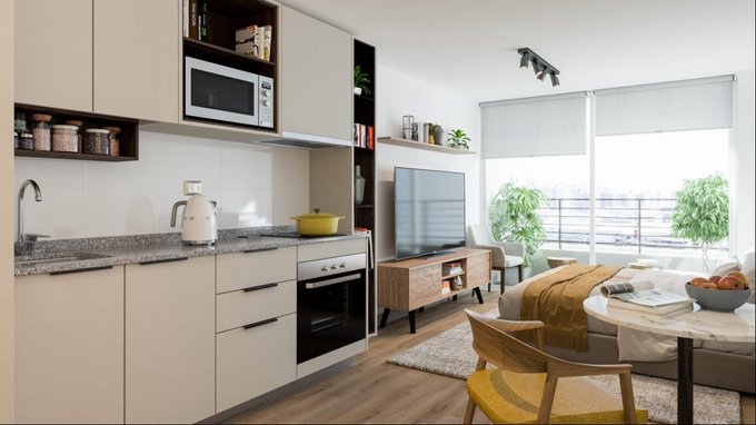 * Cocina con vitrocerámica, horno eléctrico y campana retráctil.