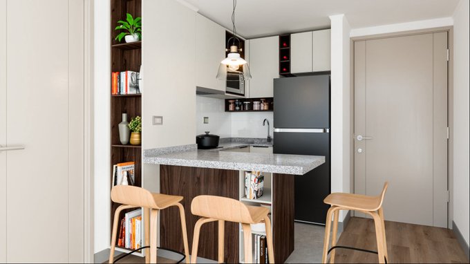 * Cocina con vitrocerámica, horno eléctrico y campana retráctil.
