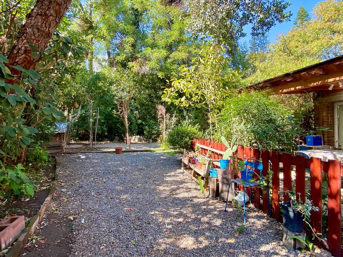 Antejardín con árboles y arbustos