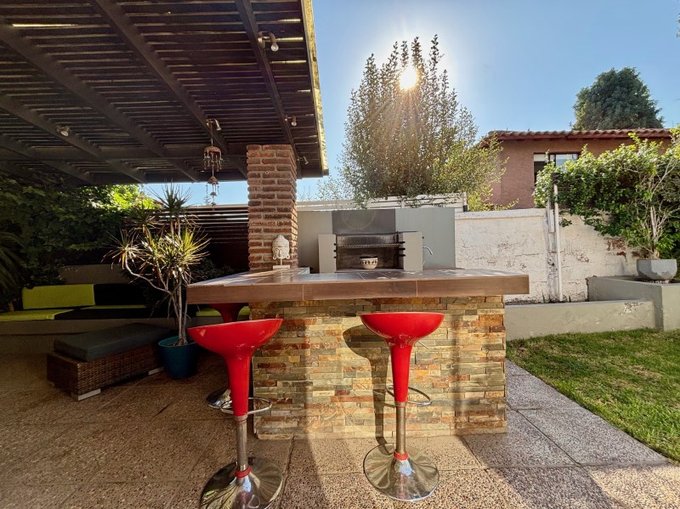 Amplio hall de entrada y distribución que nos lleva a un living y comedor separados, ambos con salida a una acogedora terraza techada, quincho con mesón en obra, jardín y piscina.