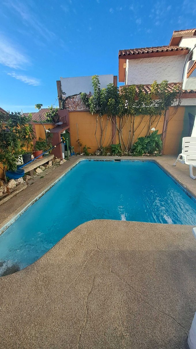 En el exterior tiene pieza de lavado, piscina, tinaja de agua caliente, y un cómodo quincho. Estacionamiento para dos vehículos .